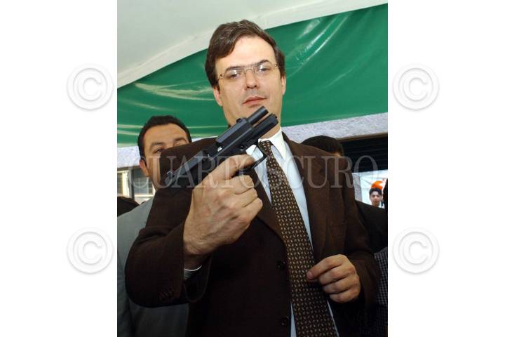 Durante la destrucción simbólica de 150 armas de juguete, el secretario de Seguridad Pública del Distrito Federal, Marcelo Ebrard Casaubón, anunció una nueva iniciativa de reforma al Código Penal para establecer que la portación de este tipo de armas sea considerado con la misma gravedad como si portara una arma verdadera. FOTO: Antonio González/CUARTOSCURO.COM.