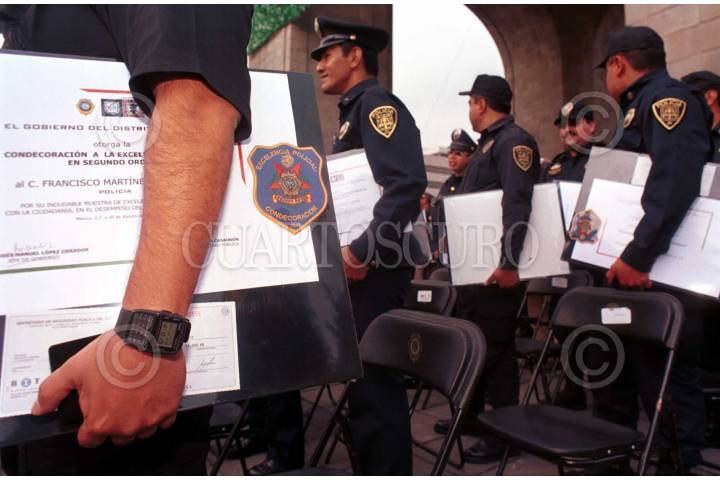 Elementos de las policias Bancaria e Industrial, Auxiliar y Preventiva, recibieron condecoraciones por parte del jefe de gobierno capitalino, Andrés Manuel López Obrador. FOTO: Oswaldo Ramirez/CUARTOSCURO.COM