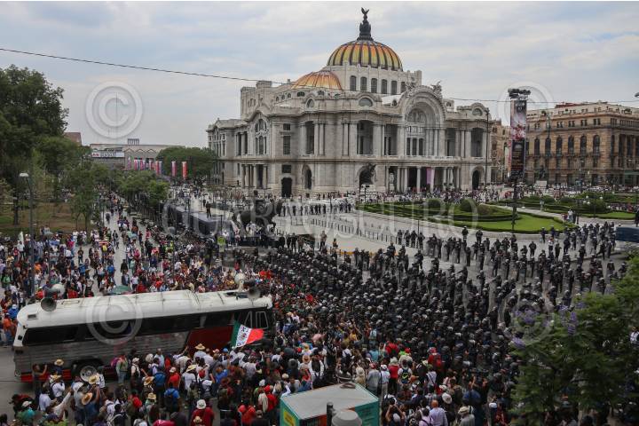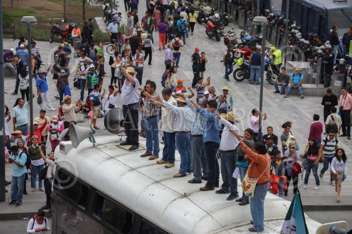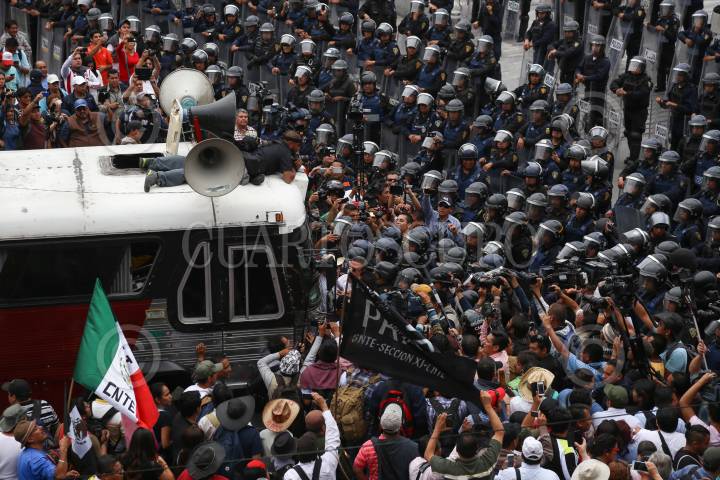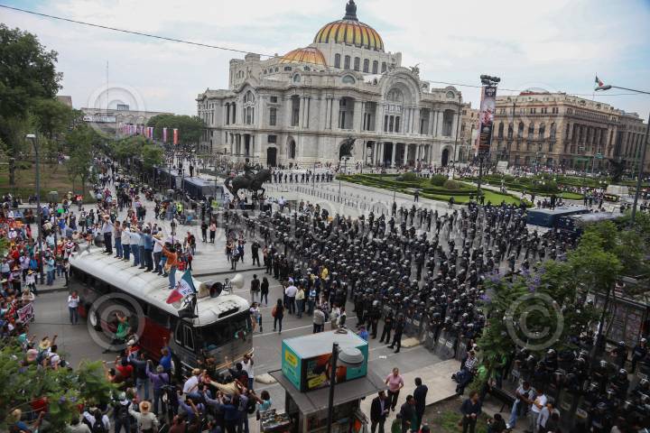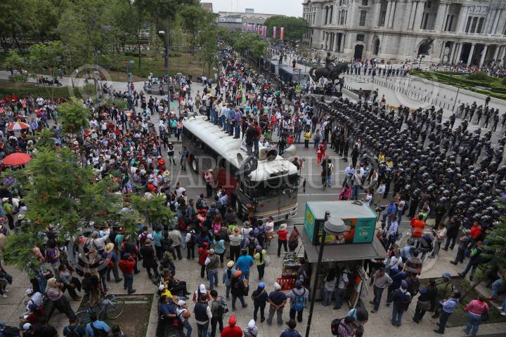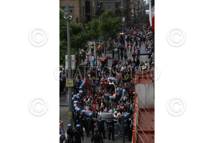 MÉXICO, D.F., 15MAYO2015.- Maestros de diversas secciones de la CNTE y SNTE, marcharon de la SEGOB hacia el zócalo de la Ciudad de México. al rededor de las 15:00 horas policías antimotines de la SSP-DF les impidieron el paso frente al palacio de Bellas Artes. Los líderes de los docentes determinaron realizar un mitin sobre la avenida Juárez después que granaderos les impidieran el paso. FOTO: SAÚL LÓPEZ /CUARTOSCURO.COM