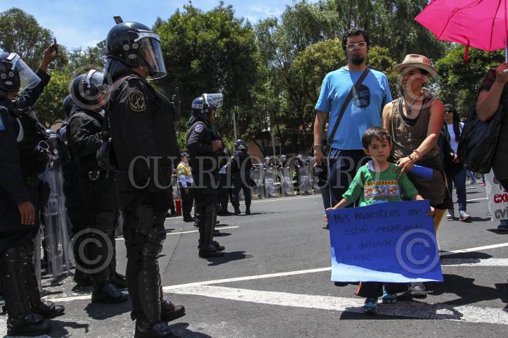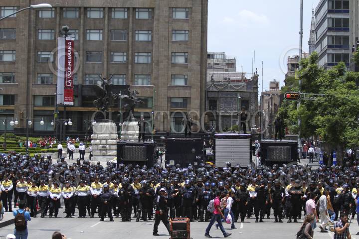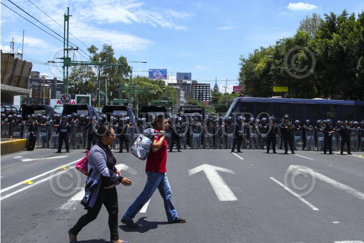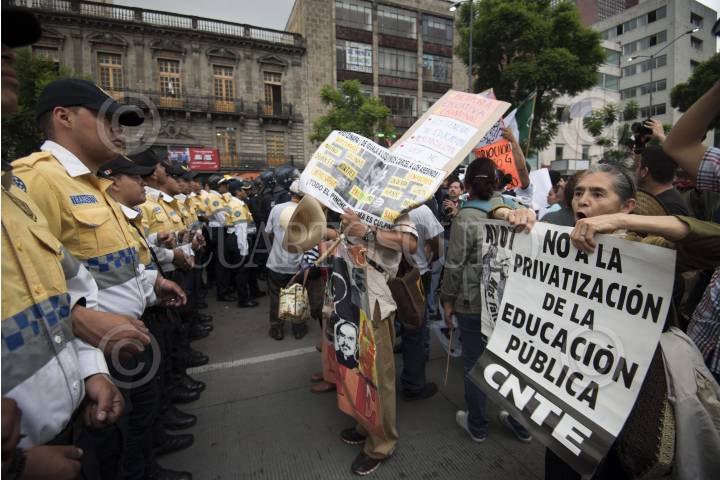 CIUDAD DE MÉXICO, 06JULIO2016.- Maestros de la Coordinadora Nacional de Trabajadores de la Educación sección 9, marcharon desde cuatros puntos de la ciudad con destino al zócalo, pero grandaderos bloquearon avenidas para impedirlo. Al final los maestros llegaron frente al hemiciclo a Juárez en donde terminaron con un mitin. FOTO: ADOLFO VLADIMIR /CUARTOSCURO.COM