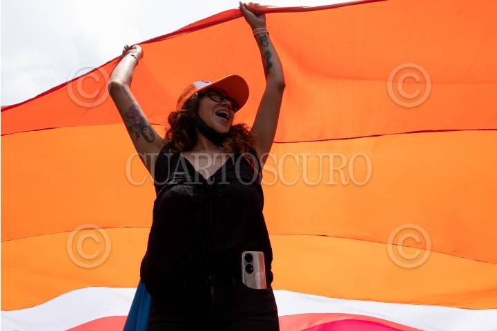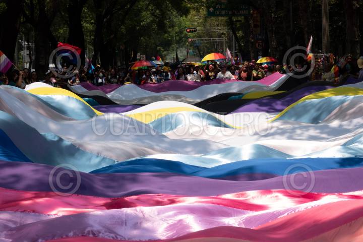 CIUDAD DE MÉXICO, 22JUNIO2024.- Varias personas sostuvieron una grande bandera lésbica durante la Marcha Lencha que se realizó desde el Ángel de la Independencia hasta el Monumento a la Revolución. FOTO: ALICE MORITZ/CUARTOSCURO.COM