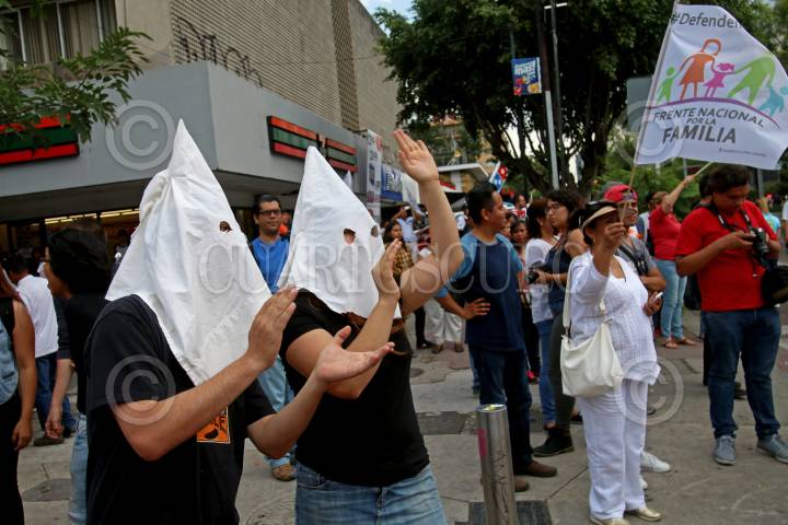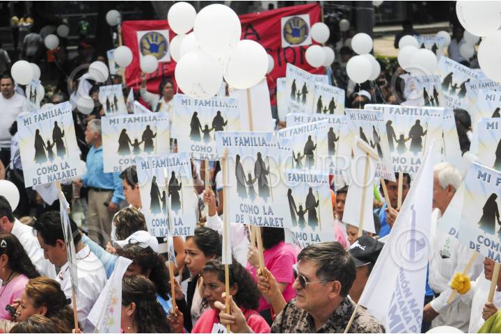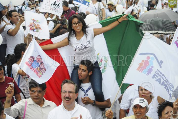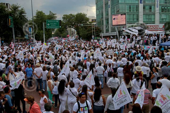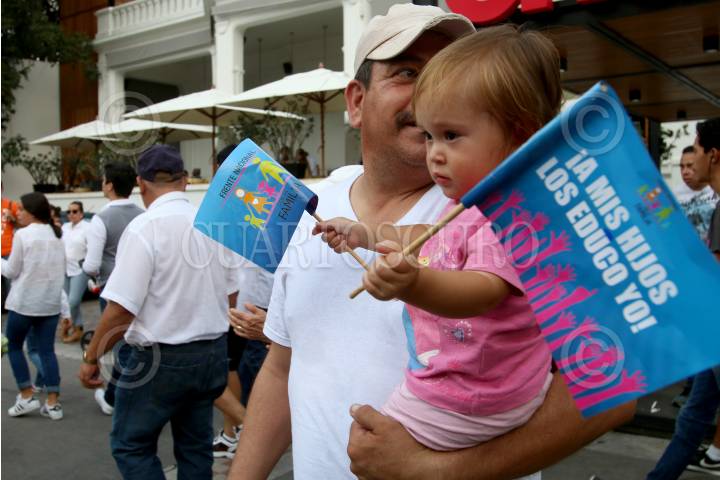 GUADALAJARA, JALISCO, 10SEPTIEMBRE2016.- Esta tarde miles de personas salieron a las calles para protestar en contra del matrimonio igualitario así como de la adopción de niños por parte de personas del mismo sexo y defender la ideología tradicional de la familia de hombre y mujer, la marcha partió de la Glorieta Minerva y finalizo en Avenida Chapultepec en donde recorrieron las principales avenidas de la ciudad, dicha marcha fue convocada por el Frente Nacional por la Familia. Cabe señalar que en algunos puntos de la marcha hubo pequeños grupos en contra de esta postura. FOTO : FERNANDO CARRANZA GARCIA / CUARTOSCURO.COM