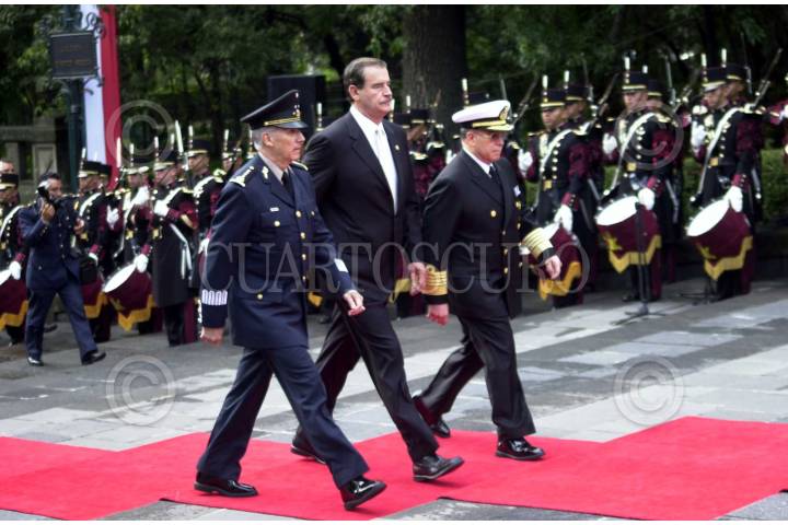 El presidente Vicente Fox, acompañado por los secretarios de la Defensa, Clemente Vega García y de la Marina, Marco Antonio Peyrot llegan a la guardia de honor en el monumento a los Niños Héroes con motivo del 156 aniversario de la gesta heroica. FOTO: Juan Pablo Zamora/CUARTOSCURO.COM