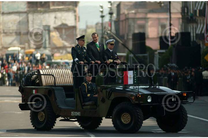 El presidente Vicente Fox, Clemente Vega, de la Defensa Nacional, Marco Antonio Peyrot, de Marina al inició del desfile militar conmemorativo de la Independencia en la Plaza de la Constitución. FOTO: Nelly Salas/CUARTOSCURO.COM