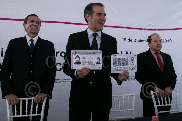 Edmundo Jacobo, consejero Electoral, Lorenzo Cordova Vianello, consejero presidente del Instituto Nacional Electoral (INE), y Marco Antonio Baños, consejero electoral, durante el inicio de producción del nuevo modelo.