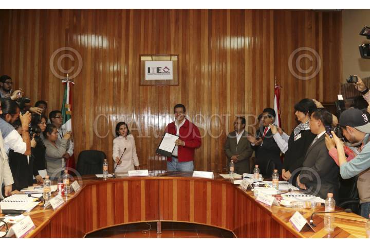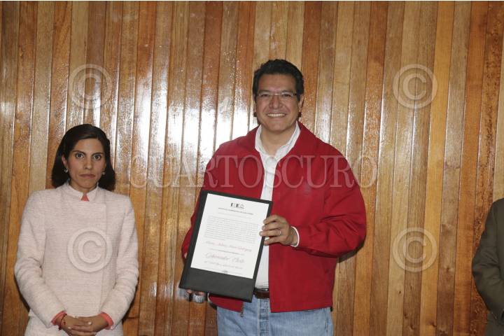 TLAXCALA, TLAXCALA, 12JUNIO2016.- Marco Antonio Mena Rodríguez, gobernador electo de la entidad, recibió de parte de integrantes del Consejo General del Instituto Tlaxcalteca de Elecciones (ITE) su constancia de mayoría respecto a las pasadas elecciones. FOTO: JORGE LEZAMA /CUARTOSCURO.COM