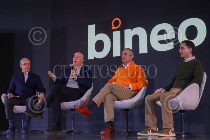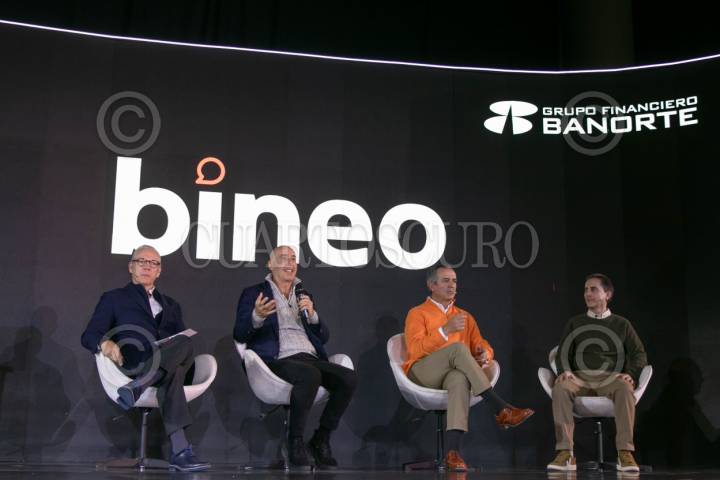 CIUDAD DE MÉXICO, 29ENERO2024.- Fernando Solís Cámara, comunicación social de Banorte; Marcos Ramírez Miguel, Director General de Banorte; Francisco Martha, encargado del Desarrollo Digital de Bineo, y Víctor Moya, director general de Bineo, presentaron Bineo, una banca ciento por ciento digital, según lo señalado por los presentes, la cual tiene una inversión inicial de 110 millones de dólares y piensa captar alrededor de 2.5 millones de usuarios en cinco años. FOTO: MOISÉS PABLO/CUARTOSCURO.COM