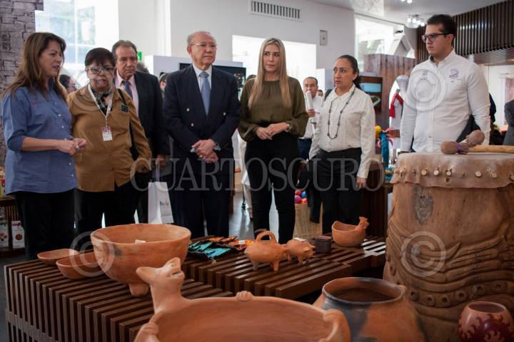 Jorge Ramón de Alva, Margarita González Saravia Calderón, Eduardo Vázquez Martín, y Lucina Jiménez López, durante la develación del billete alusivo de Lotería Nacional alusivos al Muralismo Mexicano y al Colegio de San Ildefonso.
