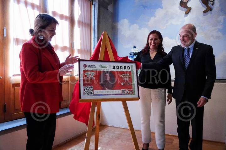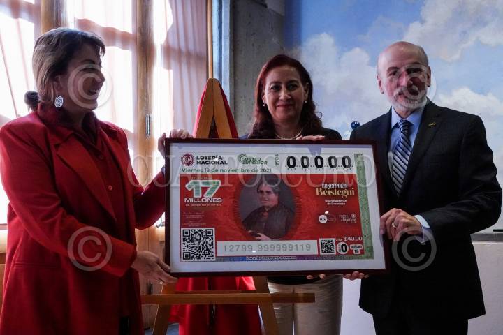 Margarita González Saravia Calderón; Angélica Solchaga Moreno y Felipe Bravo Mena presentaron el billete de lotería conmemorativo al "Bicentenario del Natalicio de Concepción Béistegui”.