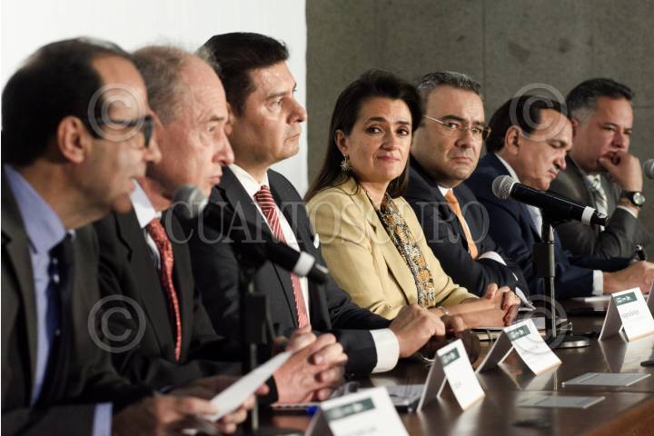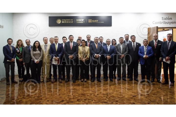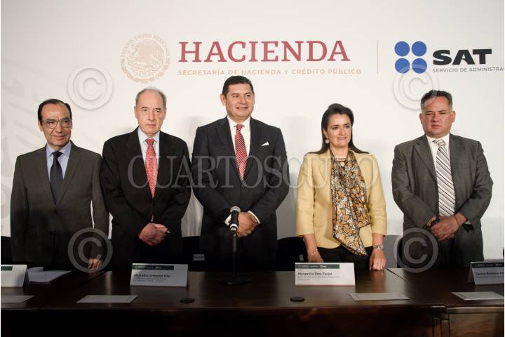 CIUDAD DE MÉXICO, 24SEPTIEMBRE2019.- Javier Treviño Cantú, director general de Políticas Públicas del CCE; Alejandro Armenta Mier, senador de Morena y presidente de la Comisión de Hacienda y Crédito Público; Margarita Ríos-Farjat jefa del Servicio de Administración Tributaria (SAT); Carlos Romero Aranda, procurador Fiscal de la Federación; José Manuel Sánchez López Campos, presidente de CONCANACO, y Santiago Nieto Castillo, titular de la Unidad de Inteligencia Financiera (UIF), encabezaron conferencia de prensa tras haber sostenido una reunión con el Consejo Directivo Nacional de la Cámara Nacional de la Industria de la Transformación (Canacintra), en la que el tema central fue fijar su postura después de que diputados reformaran el artículo 28 constitucional el cual prohíben la condonación de impuestos. FOTO: MARIO JASSO /CUARTOSCURO.COM