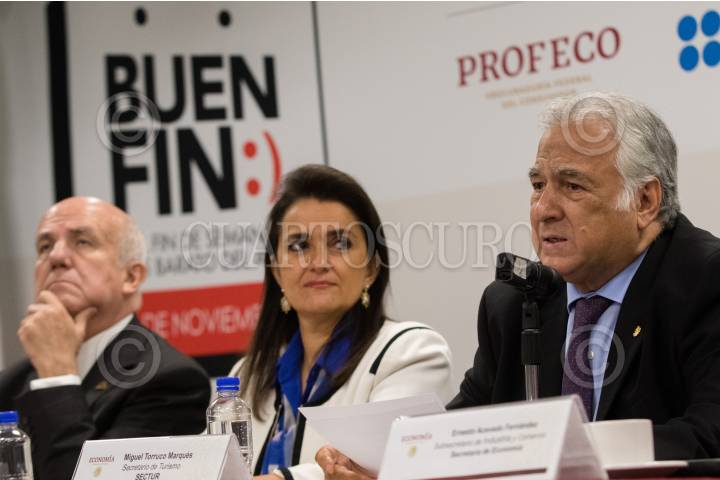 CIUDAD DE MÉXICO, 02OCTUBRE2019.- Margarita Ríos Farjat, titular del Sistema de Administración Tributaria; Miguel Torruco, secretario de Turismo, y Ernesto Acevedo Fernández, subsecretario de Industria y Comercio, durante el anunció del Buen Fin 2019. FOTO: MOISÉS PABLO /CUARTOSCURO.COM