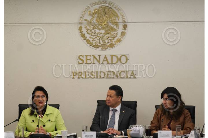 Margarita Ríos Farjat, candidata a ministra de la Suprema Corte de la Nación (SCJN), acompañada de los senadores Julio Ramón Menchaca Salazar e Indira de Jesús Rosales San Román.