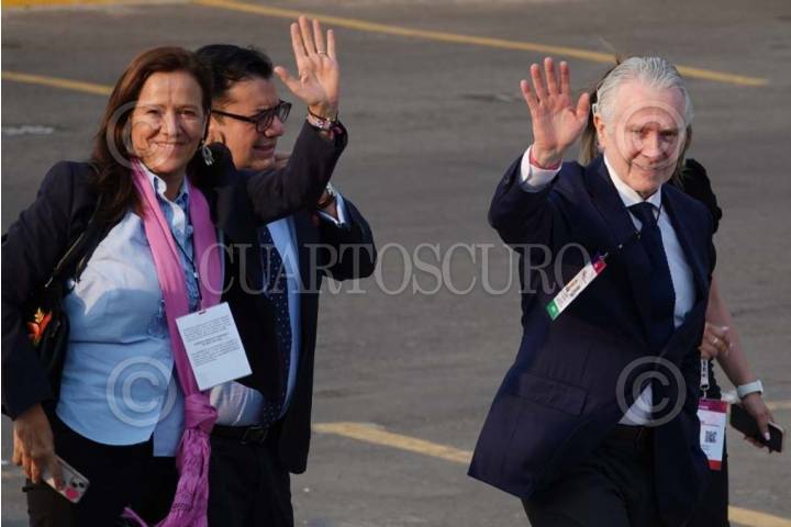 CIUDAD DE MÉXICO, 07ABRIL2024.- La diputada Margarita Zavala y Santiago Creel, coordinador de campaña de la candidata a la presidencia Xóchitl Gálvez, durante su llegada al primer debate presidencial en las instalaciones del Instituto Nacional Electoral. FOTO: GRACIELA LÓPEZ /CUARTOSCURO.COM