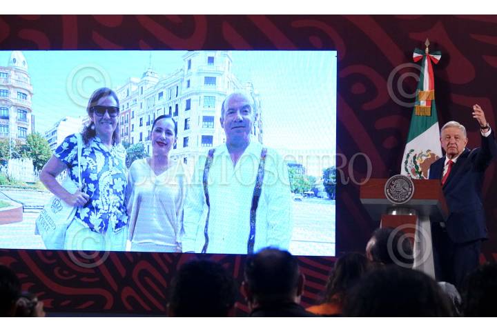 CIUDAD DE MÉXICO, 15AGOSTO2024.- Andrés Manuel López Obrador, presidente de México, mostró una lámina en donde se muestra en España a la diputada Margarita Zavala acompañada de Sandra Cuevas, ex alcaldesa de Cuauhtémoc y Felipe Calderón, ex presidente de México, durante la conferencia mañanera en Palacio Nacional. FOTO: GRACIELA LÓPEZ /CUARTOSCURO.COM