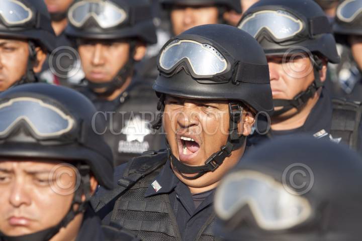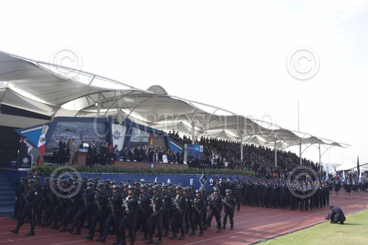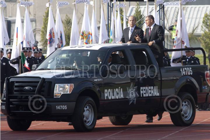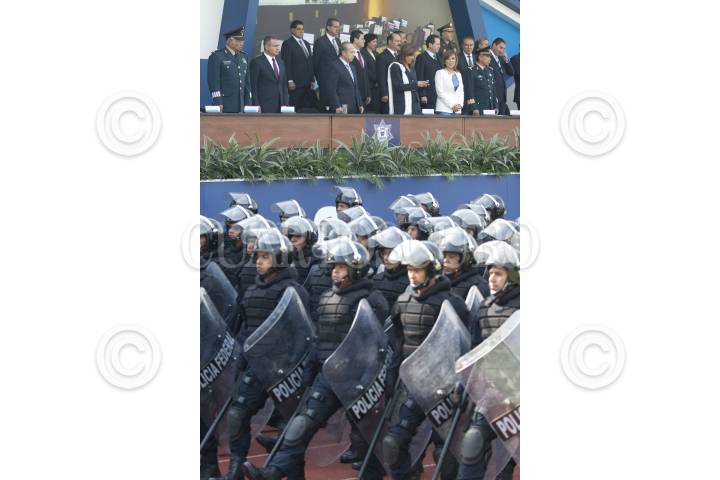MÉXICO, D.F., 02JUNIO2012.- Federales antimotines pasan revista frente a Felipe Calderón Hinojosa, Presidente de México, quien encabezó la ceremonia del Día del Policía en el Centro del Mando de la Policía Federal. FOTO: MOISÉS PABLO /CUARTOSCURO.COM