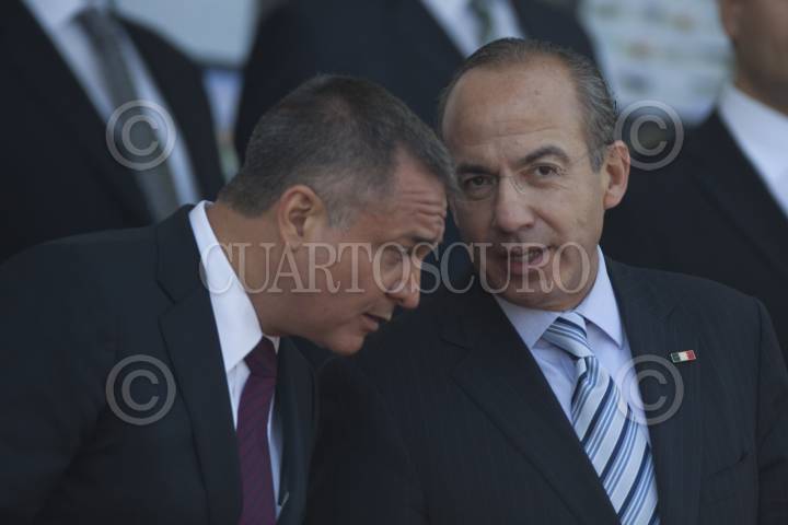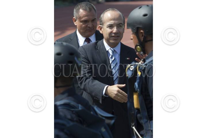 MÉXICO, D.F., 02JUNIO2012.- Genaro García Luna, secretario de Seguridad Pública Federal, y Felipe Calderón Hinojosa, Presidente de México, durante la ceremonia del Día del Policía en el Centro del Mando de la Policía Federal. FOTO: MOISÉS PABLO /CUARTOSCURO.COM
