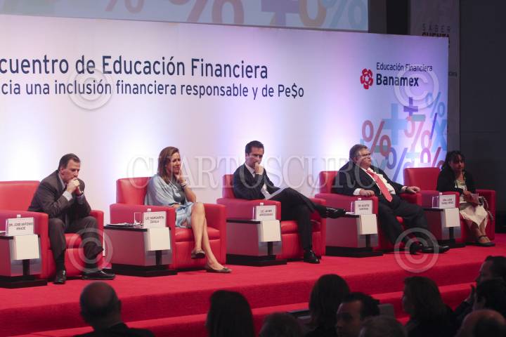 MÉXICO D.F., 05JUNIO2012.- José Antonio Meade, Secretario de Hacienda, Margarita Zavala, esposa del presidente de México, Javier Arrigunaga, director general de Grupo Financiero Banamex y Agustín Carstens, gobernador del Banco de México, durante el encuentro de educación financiera Banamex. FOTO: SAÚL LÓPEZ /CUARTOCURO.COM