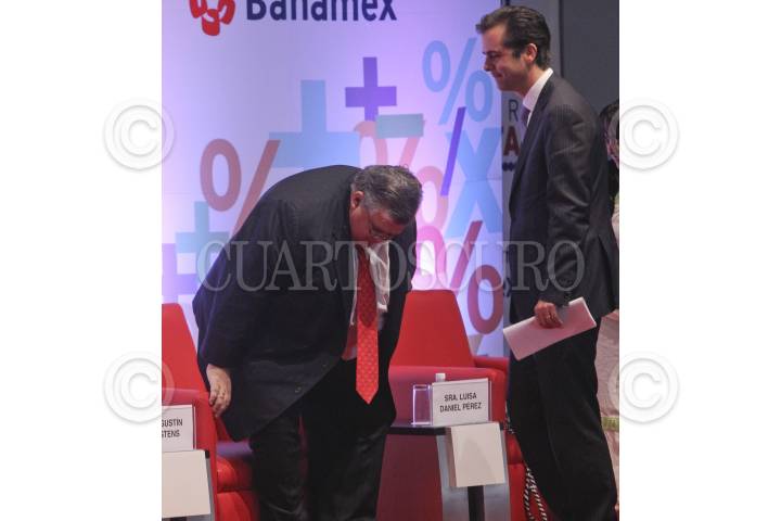 MÉXICO D.F., 05JUNIO2012.- Agustín Carstens, gobernador de Banco de México y Javier Arrigunaga, director general de Grupo Financiero Banamex, durante el encuentro de educación financiera Banamex. FOTO: SAÚL LÓPEZ /CUARTOCURO.COM