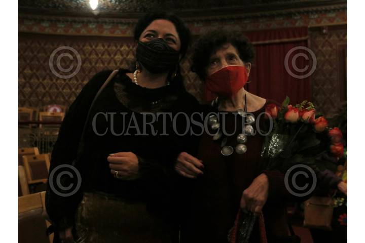 Alejandra Frausto Guerrero, secretaria de Cultura y Margo Glantz, escritora al finalizar obra basada en la obra de la escritora en el Teatro Juárez como parte de la cartelera del Festival Internacional Cervantino 2021.