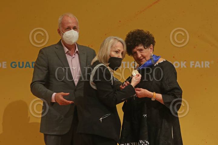 La periodista Silvia Lemus, Viuda del escritor Carlos Fuentes, Raúl Padilla López Presidente de la FIL durante la entrega de la medalla del reconocido escritor mexicano ya mencionado, a la escritora mexicana Margo Glantz.