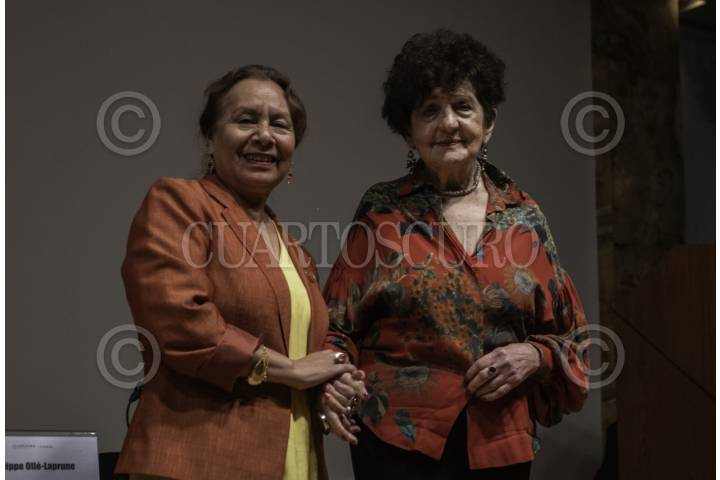 Margo Glantz, escritora mexicana y la poeta Gabriela Jáuregui durante el evento previo a la entrega de la medalla Carlos Fuentes, esto en el marco de la edición 35 de la FIL.