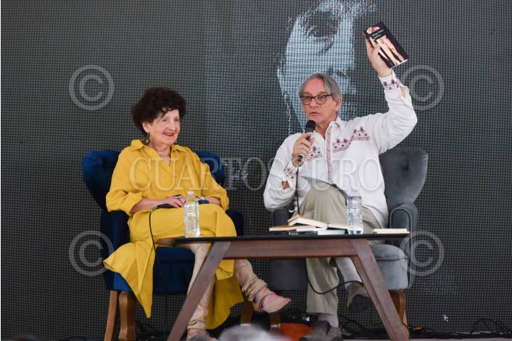 CIUDAD DE MÉXICO, 15JUNIO2024.- Margo Glantz, escritora y ensayista mexicana, y Alberto Muy-Sánchez, editor y escritor mexicano, durante su intervención como parte de las actividades de la Feria Internacional del Libro en Coyoacán (FILCO), realizado en el Jardín Hidalgo. FOTO: MARIO JASSO/CUARTOSCURO.COM