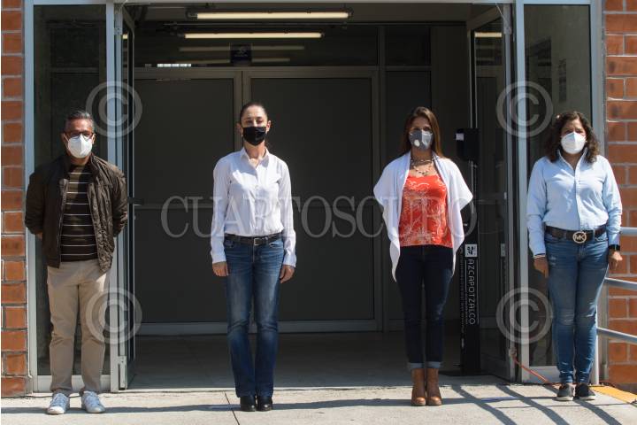 Vidal Llerenas, alcalde de Azcapotzalco; Claudia Sheinbaum, Jefa de Gobierno; y Mari José Alcalá, clavadista olímpica, durante la inauguración de la Alberca Semiolímpica Renovación Nacional.