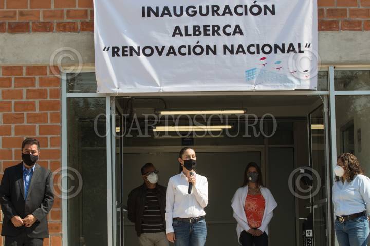 Los clavadistas Fernando Platas, Adriana Jiménez, y Mari José Alcalá acompañaron a la Jefa de Gobierno, Claudia Sheinbaum, a la inauguración de la Alberca Semiolímpica Renovación Nacional.