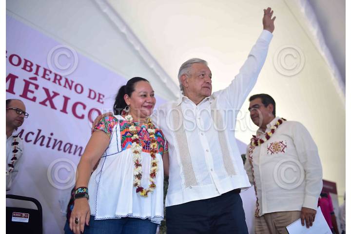 Andrés Manuel López Obrador y María Luisa Albores durante la supervisión de programas para el Bienestar en el municipio de Huauchinango.
