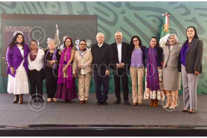 MORELIA, MICHOACÁN, 08MARZO2024.- Alejandra Frausto, secretaria de Cultura; Raquel Buenrostro, secretaria de Economía; Nadine Gasman, presidenta del Instituto Nacional de las Mujeres (INMUJERES); Leticia Ramírez, secretaria de Educación; Rosa Icela Rodríguez, secretaria de Seguridad Pública y Protección Ciudadana; Andrés Manuel López Obrador, presidente de México; Alfredo Ramírez Bedolla, gobernador de Michoacán; Luisa María Alcalde, secretaria de Gobernación; Maria Luisa Albores, secretaria de Medio Ambiente y Recursos Naturales; María Estela Ríos González, consejera jurídica del Ejecutivo Federal, y Ariadna Montiel Reyes, secretaria del Bienestar, acompañaron al presidente tras su conferencia matutina. FOTO: GALO CAÑAS/CUARTOSCURO.COM