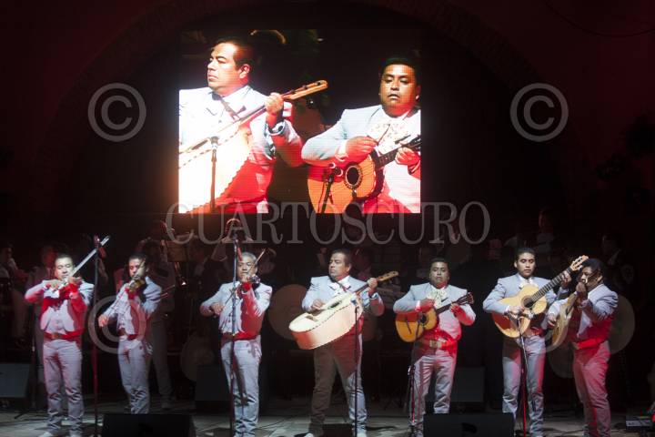 MÉXICO, D.F., 29NOVIEMBRE2012.- El Mariachi Vargas de TEcatitlán, interpretó los temas musicales más famosos del compositor Rubén Fuentes como "La Vikina" y "Cien Años" la noche de ayer en el homenaje que el empresario Jesús Arroyo le realizó en su restaurante al sur de la ciudad. FOTO: FRANCISCO RODRÍGUEZ /CUARTOSCURO.COM