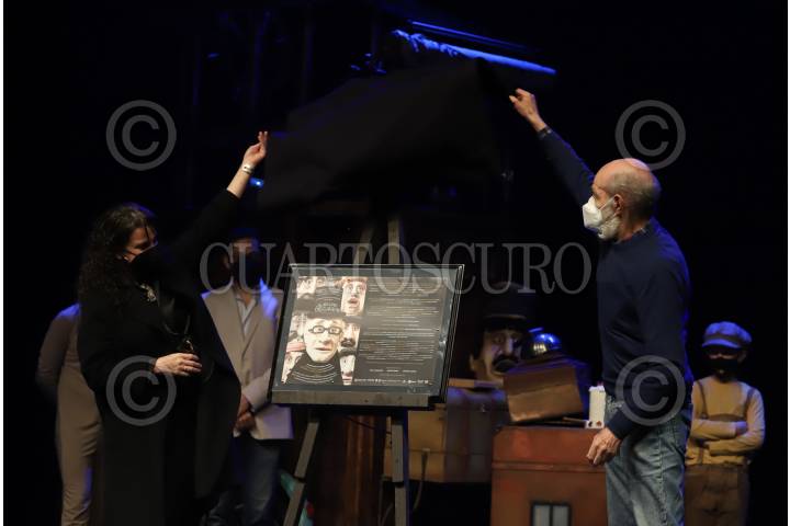 Mariana Garza y Luis de Tavira durante la develación de placa por el fin de temporada de la obra infantil “A golpe de calcetín” en el Teatro Helénico.