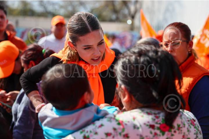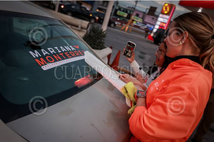 MONTERREY, NUEVO LEÓN, 06ENERO2024.- Mariana Rodríguez, Precandidata única por Movimiento ciudadano para la alcaldía de Monterrey, acudió con vecinos de la Colonia Fomerrey 35 y Valle de Santa Lucía, así mismo realizó pega de calcas en automóviles. FOTO: MC MONTERREY/CUARTOSCURO.COM