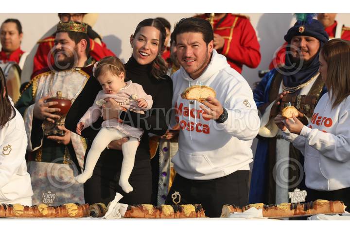 MONTERREY, NUEVO LEÓN, 06ENERO2024.-El gobernador Samuel García y su esposa Mariana Rodríguez encabezaron el evento de repartir una Macro Rosca en la Explanada de los Héroes, acompañados por miembros del gabinete del estado de Nuevo León. FOTO: GOBIERNO NL / CUARTOSCURO.COM