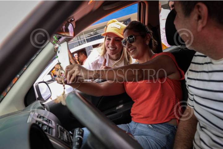 MONTERREY, NUEVO LEÓN, 31MARZO2024.- Mariana Rodríguez, candidata a alcaldesa de Monterrey, inicia su campaña pegando calcas en automóviles al poniente de la ciudad de Monterrey, quien fue acompañada por el candidato presidencial Jorge Álvarez Maynez. FOTO: CUARTOSCURO.COM