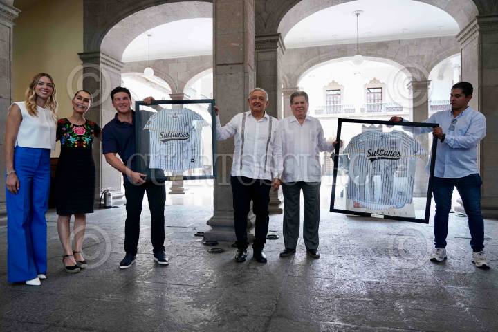 MONTERREY, NUEVO LEÓN, 18AGOSTO2024.- Samuel García, gobernador de Nuevo León, le obsequio unas playeras del equipo de beisbol de los Sultanes al Presidente de México, Andrés Manuel López Obrador, al finalizar el evento de supervisión del programa Jóvenes Construyendo el Futuro, que se realizó en la explanada de los Héroes. En la imagen los acompaña Mariana Rodríguez, esposa del mandatario regio, y Claudia Sheinbaum, Presidenta Electa de México. FOTO: PRESIDENCIA/CUARTOSCURO.COM