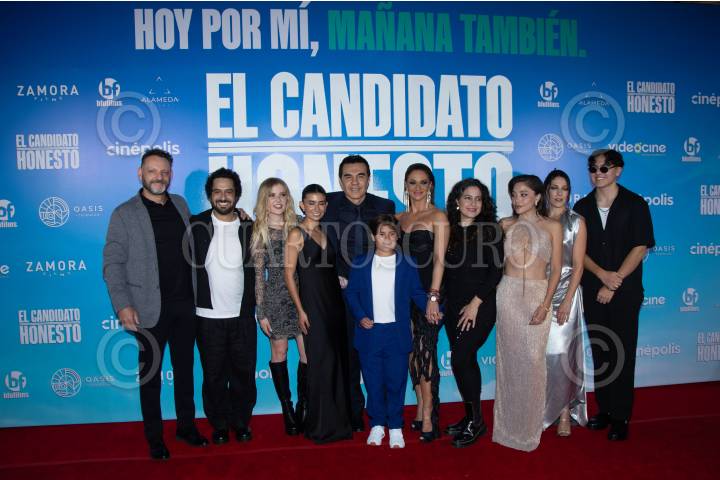 CIUDAD DE MÉXICO, 06AGOSTO2024. Parte del elenco a su paso por la alfombra roja que celebra el estreno de la película “El Candidato Honesto”, en una plaza al sur de la ciudad. FOTO: EDGAR NEGRETE LIRA/CUARTOSCURO.COM