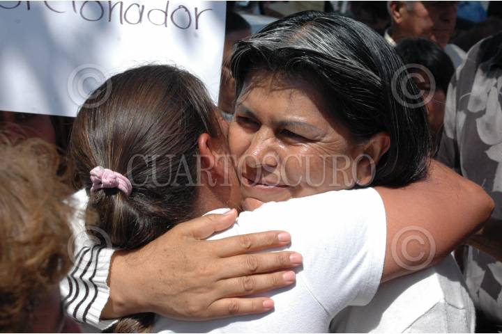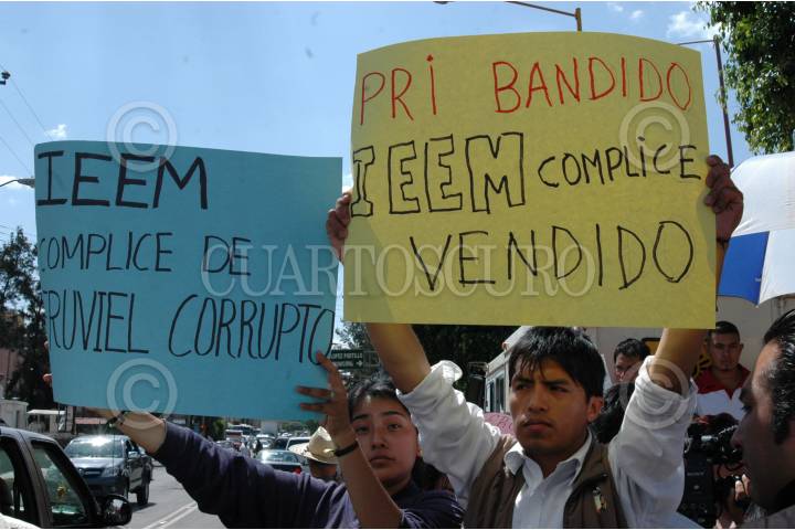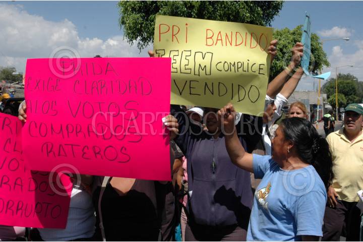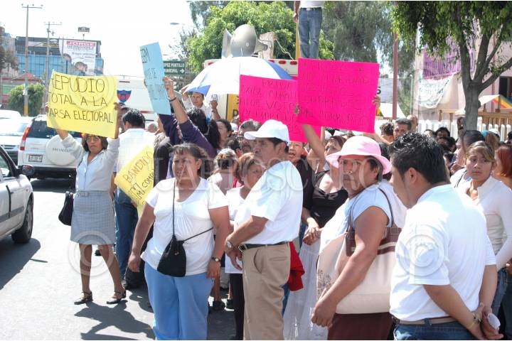 ECATEPEC, EDO. DE MÉXICO, 08JULIO2009.- Acompañada de más de 100 simpatizantes perredistas, la candidata a la alcaldía local por el PRD-PT, Maribel Alva Olvera, se manifestó frente a la junta distrital del Instituto Electoral del Estado de México (IEEM), ubicada en San Cristobal Ecatepec, y dijo desconocer el virtual triunfo del priista, Eruviel Ávila Villegas. FOTO: MARIO NULO/CUARTOSCURO.COM