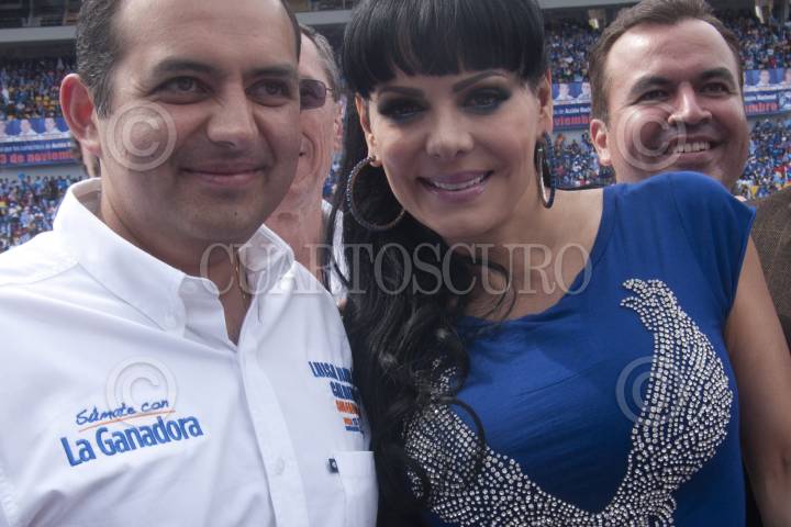 MORELIA, MICHOACÁN, 06NOVIEMBRE2011.- El precandidato presidencial por el Partido Acción Nacional, Ernesto Cordero se "tomó" la foto con la conductora Maribel Guardia al finalizar el cierre de campaña de Luisa María Calderón Hinojosa la tarde de hoy en el estadio Morelos en vísperas de las elecciones a la gubernatura el próximo domingo 13 de Noviembre. FOTO: FRANCISCO RODRÍGUEZ/CUARTOSCURO.COM