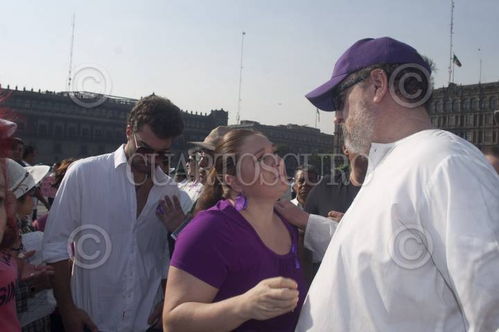 MÉXICO, D.F., 26MAYO2012.- La esposa del actor, Rogelio Guerra, la señora Maribel de Guerra, dialóga con un simpatizante del actor el cual no se presentó a la marcha convocada para este Sábado, en su apoyo debido a que Azteca Novelas le pidió al actor llegar a un acuerdo y que para que este llegara a buen término el debía desistirse de acudir al Zócalo esta mañana. Rogelio Guerra perdió un juicio contra la televisora del Ajusco por incumplimiento de contrato, por lo que la empresa se queda con el nombre artisitico de Hildegardo Francisco Guerra Martinez, su verdadero nombre, además deberá pagar una suma cercana a los 36 millones de pesos, por lo que estaban a punto de perder su casa por embargo de la televisora. La esposa de Rogelio Guerra agradeció las muestras de apoyo y pidio a los simpatizantes que acudieron a la plaza de la Constitución esperar a que concluyan las negociaciones. FOTO: FRANCISCO RODRÍGUEZ /CUARTOSCURO.COM