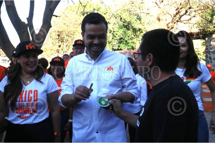 TEPOZTLÁN, MORELOS, 04ABRIL2024.- Jorge Álvarez Maynez, candidato a la Presidencia de la Republica por Movimiento Ciudadano, acompaño a Jessica Ortega de la Cruz, candidata a la gubernatura de Morelos, en su arranque de campaña realizado en este municipio. En la imagen recibe un cigarro de marihuana de un activista pro-liberación del uso recreativo del cannabis. FOTO: MARGARITO PÉREZ RETANA/CUARTOSCURO.COM