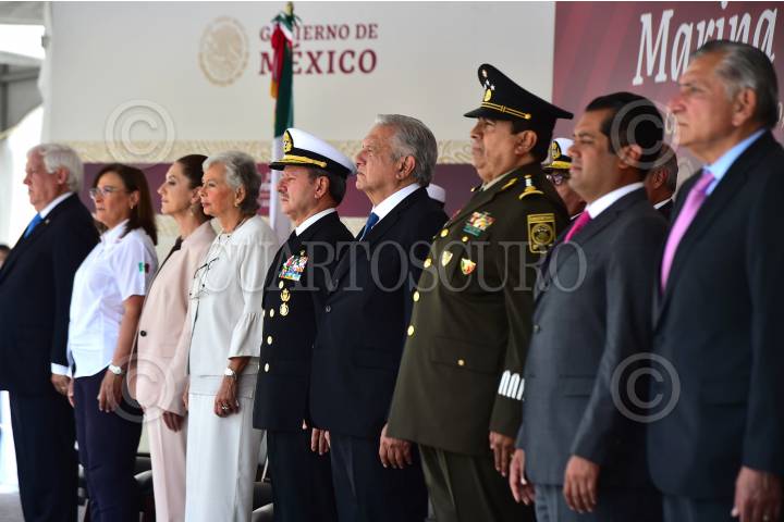Andrés Manuel López Obrador, presidente de México, presidió el Día de la Marina Nacional en la Secretaría de Marina - Armada de México. Lo acompañan Víctor Manuel Villalobos Arámbula, secretario de Agricultura y Desarrollo Rural; Rocío Nahle García, secretaria de Energía; Claudia Sheinbaum Pardo, jefa de Gobierno de la Ciudad de México; Olga Sánchez Cordero, presidenta de la Mesa Directiva de la Cámara de Senadores; José Rafael Ojeda Durán, secretario de Marina; Agustín Radilla Suastegui, subsecretario de la Defensa Nacional; Sergio Carlos Gutiérrez Luna, presidente de la Mesa Directiva de la Cámara de Diputados, y Adán Augusto López Hernández, secretario de Gobernación.