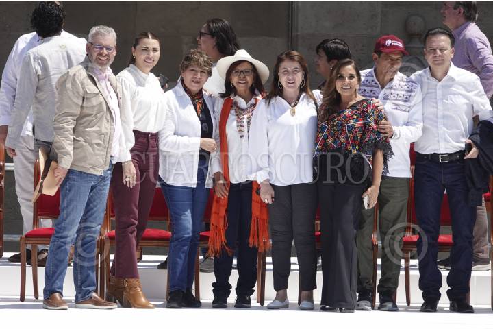 CIUDAD DE MÉXICO, 09MARZO2025.- Alfredo Ramírez Bedolla, Gobernador de Michoacán, Marina del Pilar Ávila Olmeda, Gobernadora del Estado de Baja California, Delfina Gómez Álvarez, Gobernadora del Estado de México, Gabriela Romero Martínez, Directora de Atención y Audiencia Ciudadana, Esteban Alejandro Villegas Villarreal, Gobernador del Estado de Durango, durante la Asamblea Informativa en el Zócalo de la Ciudad de México. FOTO: MAGDALENA MONTIEL/CUARTOSCURO.COM