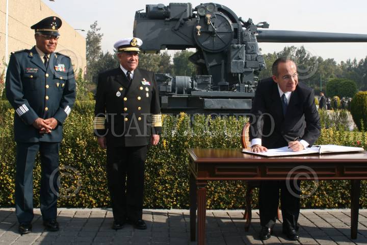 MÉXICO, D.F. 19DICIEMBRE2006.- El presidente Felipe Calderón Hinojosa desayunó este martes con personal naval encabezado por el secretario de Marina-Armada de México, Mariano Francisco Saynez, con motivo del fin de año. En la imagen con Guillermo Galván, secretario de la defensa nacional durante la firma del libro oficial. FOTO: PAOLA HIDALGO/CUARTOSCURO.COM