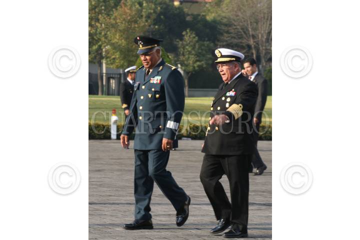 MÉXICO, D.F. 19DICIEMBRE2006.- El presidente Felipe Calderón Hinojosa desayunó este martes con personal naval encabezado por el secretario de Marina-Armada de México, Mariano Francisco Saynez, con motivo del fin de año. En la imagen con Guillermo Galván, secretario de la defensa nacional. FOTO: PAOLA HIDALGO/CUARTOSCURO.COM