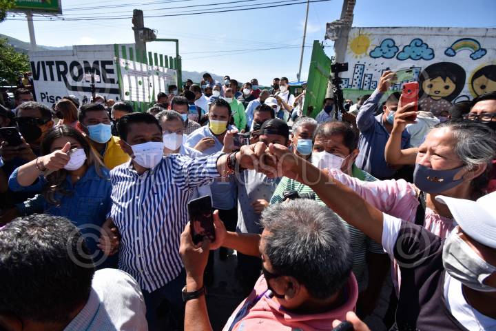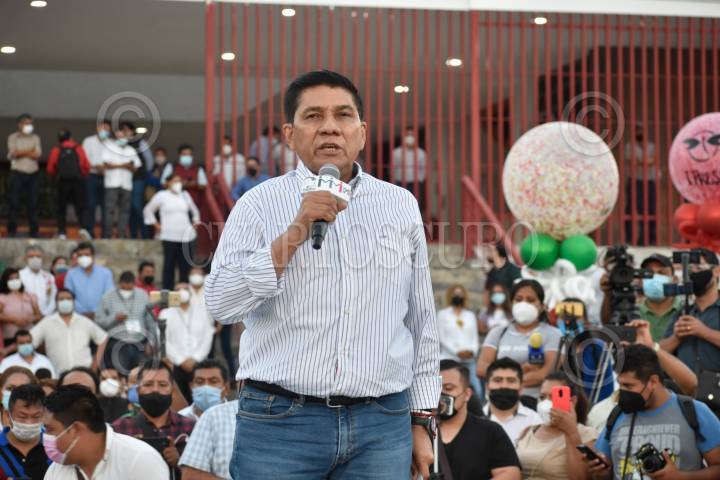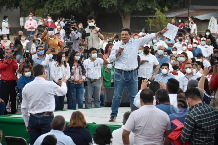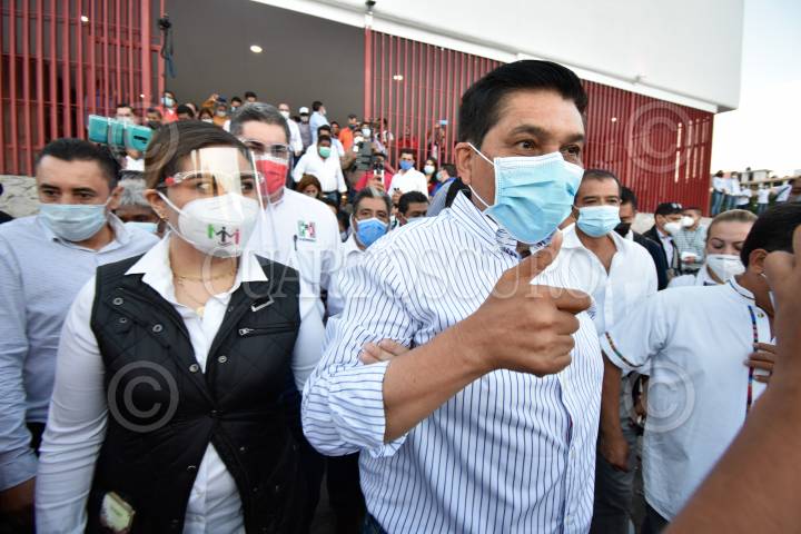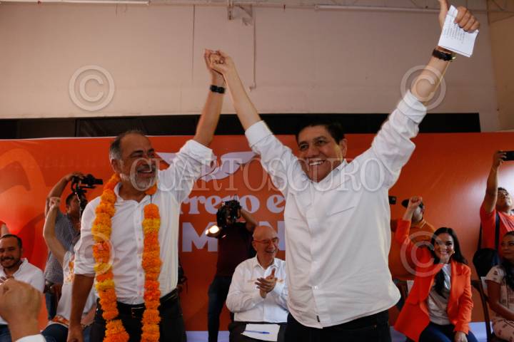 Alejandro Arcos Catalán, candidato a la alcaldía de Chilpancingo por la coalición PRI-PRD, inició su campaña electoral en la cual prometió agua para este municipio. En la imagen Mario Moreno Arcos, candidato a la gubernatura de Guerrero, le alza el brazo.