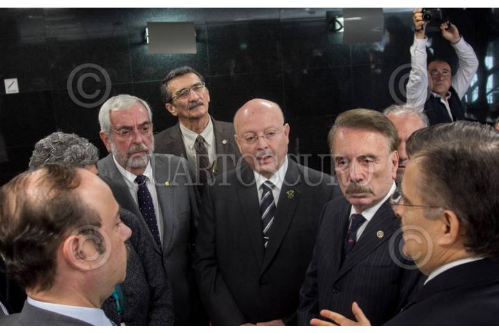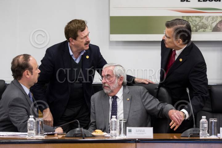 CIUDAD DE MÉXICO, 19DICIEMBRE2018.- Jaime Valls Esponda, secretario general ejecutivo de la Asociación Nacional de Universidades e Instituciones de Educación Superior (ANUIES), Juan Carlos Romero Hicks, coordinador de la bancada panista, Enrique Garue Wiechers, rector de la Universidad Nacional Autónoma de México (UNAM), y Tonatiuh Bravo, coordinador de Movimiento Ciudadano, durante su participación, en la Cámara de Diputados, en la reunión con la Junta de Coordinación Política (JUCOPO) y ANUIES respecto al tema de recorte al presupuesto para universidades, propuesto en el paquete económico 2019. No obstante, el presidente Andrés Manuel López Obrador declaró, el día de ayer, que ya no se recortaría el gasto de las instituciones educativas. FOTO: GALO CAÑAS /CUARTOSCURO.COM