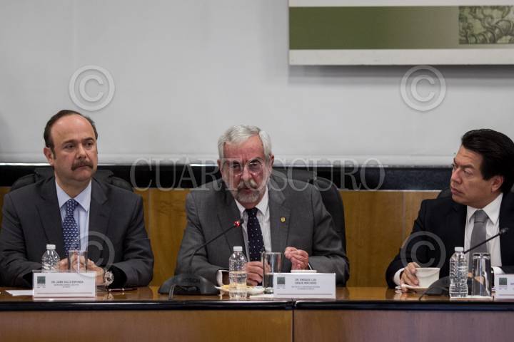 CIUDAD DE MÉXICO, 19DICIEMBRE2018.-Jaime Valls Esponda, secretario general ejecutivo de la Asociación Nacional de Universidades e Instituciones de Educación Superior (ANUIES), Enrique Graue Wiechers, rector de la Universidad Nacional Autónoma de México (UNAM), y Mario Delgado, coordinador morenista, durante su participación, en la Cámara de Diputados, en la reunión con la Junta de Coordinación Política (JUCOPO) y ANUIES respecto al tema de recorte al presupuesto para universidades, propuesto en el paquete económico 2019. No obstante, el presidente Andrés Manuel López Obrador declaró, el día de ayer, que ya no se recortaría el gasto de las instituciones educativas. FOTO: GALO CAÑAS /CUARTOSCURO.COM