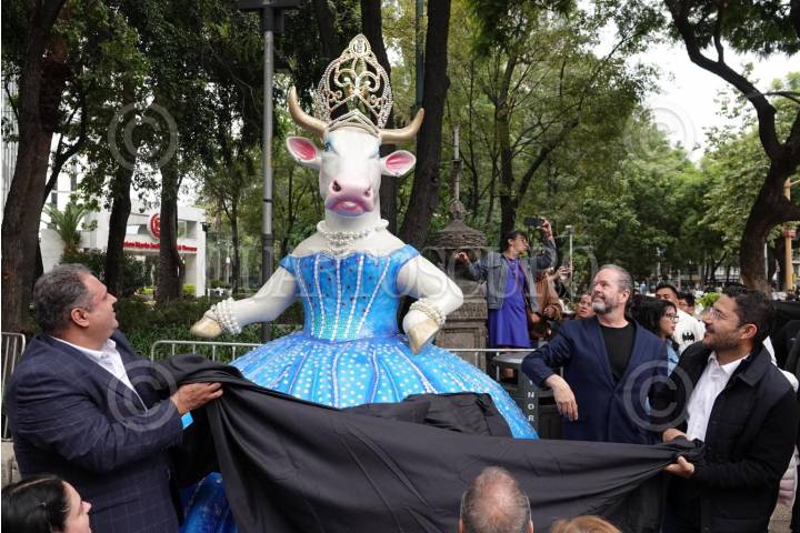 Mario Soto, director General de Cow Parade México; Paul Zarkin, presidente de Cow Parade México, y Martí Batres, jefe de Gobierno, durante la develación de una hora quinceañera del Cow Parade 2023 en Paseo de la Reforma