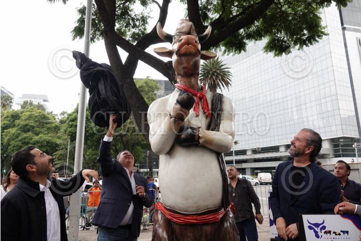 Mario Soto, director General de Cow Parade México; Paul Zarkin, presidente de Cow Parade México, y Martí Batres, jefe de Gobierno, durante la develación de un toro del Cow Parade 2023 en Paseo de la Reforma